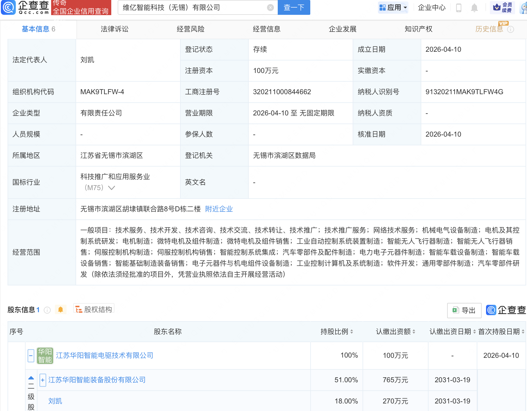 企查查APP显示,近日,维亿智能科技(无锡)有限公司成立,经营范围包含:智能无人飞行器制造;智能无人飞行器销售;伺服控制机构制造;伺服控制机构销售;智能控制系统集成等。企查查股权穿透显示,该公司由华阳智能(301502)旗下江苏华阳智能电驱技术有限公司全资持股。
