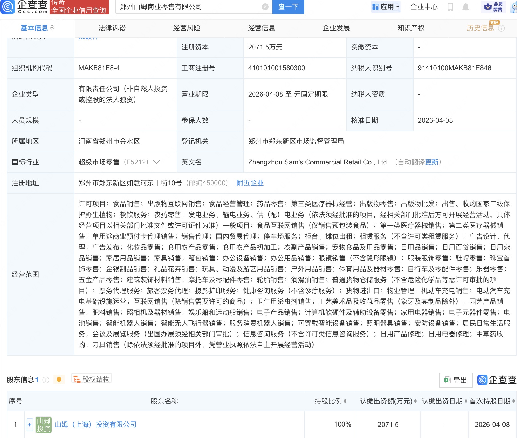 企查查APP显示,近日,郑州山姆商业零售有限公司成立,法定代表人为郑硕怀,注册资本2071.5万人民币,经营范围包括食品销售、食品互联网销售、日用百货销售等。企查查股权穿透显示,该公司由山姆(上海)投资有限公司全资持股。