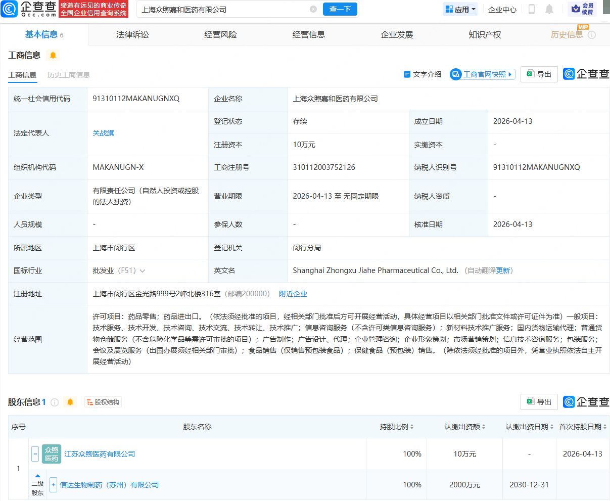 企查查APP显示,近日,上海众煦嘉和医药有限公司成立,法定代表人为关战旗,经营范围包含:药品零售;药品进出口;国内货物运输代理;食品销售(仅销售预包装食品);保健食品(预包装)销售等。企查查股权穿透显示,该公司由信达生物(01801.HK)间接全资持股。