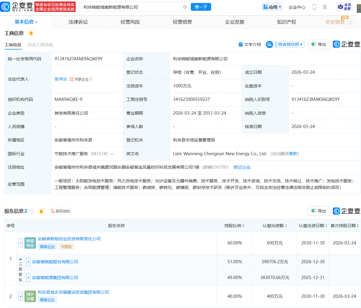 企查查APP显示,近日,利辛皖能城南新能源有限公司成立,法定代表人为张学东,注册资本为1000万元,经营范围包含:太阳能发电技术服务;风力发电技术服务;光伏设备及元器件销售;储能技术服务等。企查查股权穿透显示,该公司由皖能电力(000543)旗下安徽省新能创业投资有限责任公司、利辛县城乡发展建设投资集团有限公司共同持股。