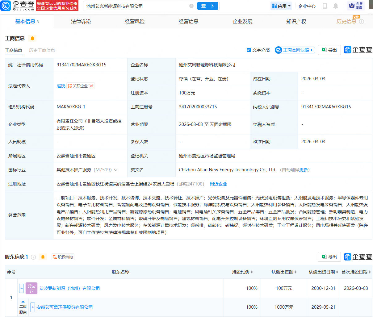 企查查APP显示,近日,池州艾岚新能源科技有限公司成立,法定代表人为赵锐,经营范围包含:光伏发电设备租赁;太阳能发电技术服务;半导体器件专用设备销售;电子专用材料销售;海洋能系统与设备销售等。企查查股权穿透显示,该公司由艾可蓝(300816)间接全资持股。