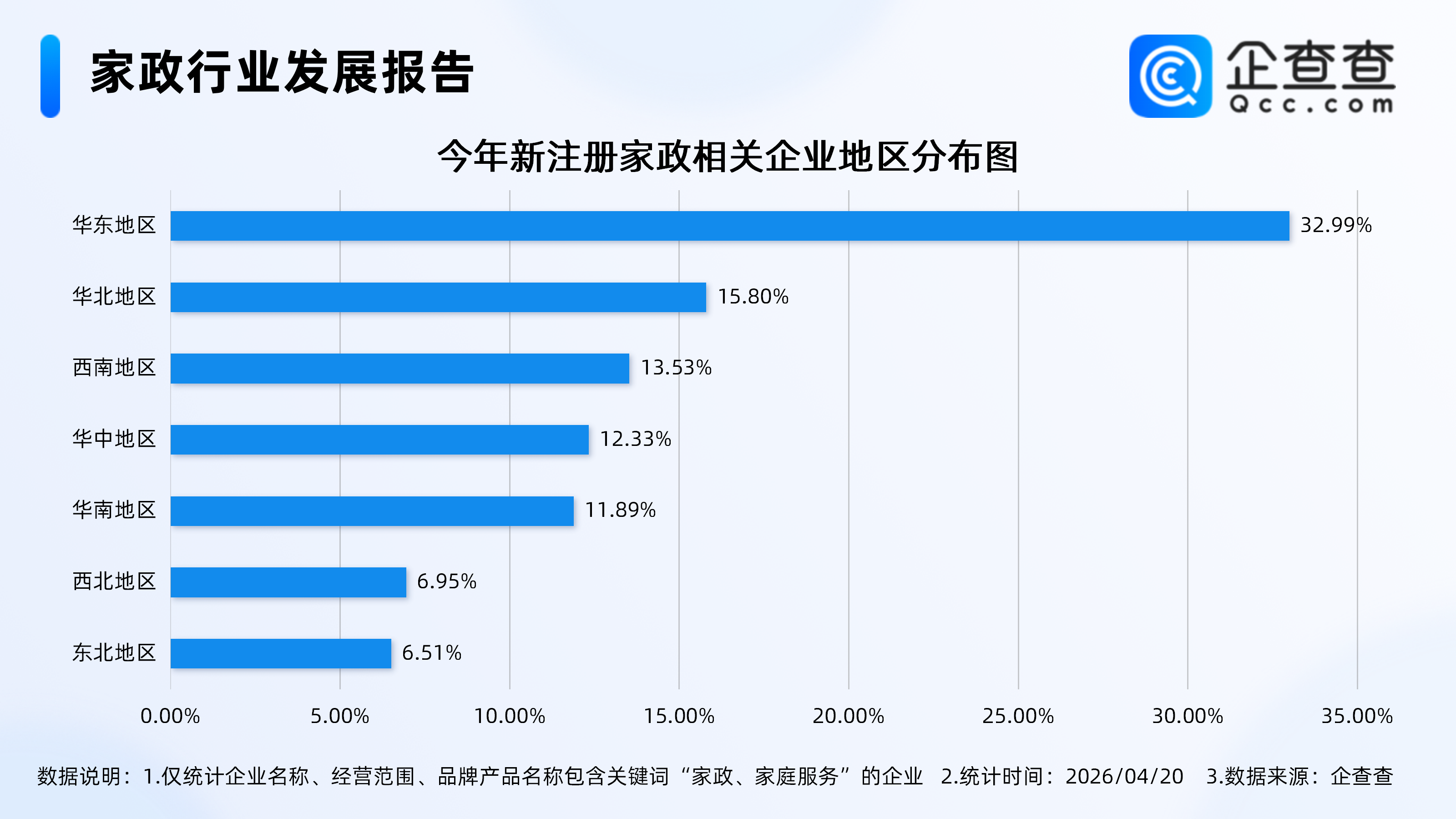 企查查数据显示,截至4月20日,国内现存家政相关企业302.78万家。其中,成立年限在1-3年的相关企业最多,占比28.29%。从注册资本来看,家政相关企业多为轻量级企业,注册资本在200万元以内的企业合计占比超七成,其中注册资本在100万元以内的企业最多,占比60.21%。注册量方面,今年已注册13.4万家相关企业,其中分布在华东地区的企业最多,占比32.99%。