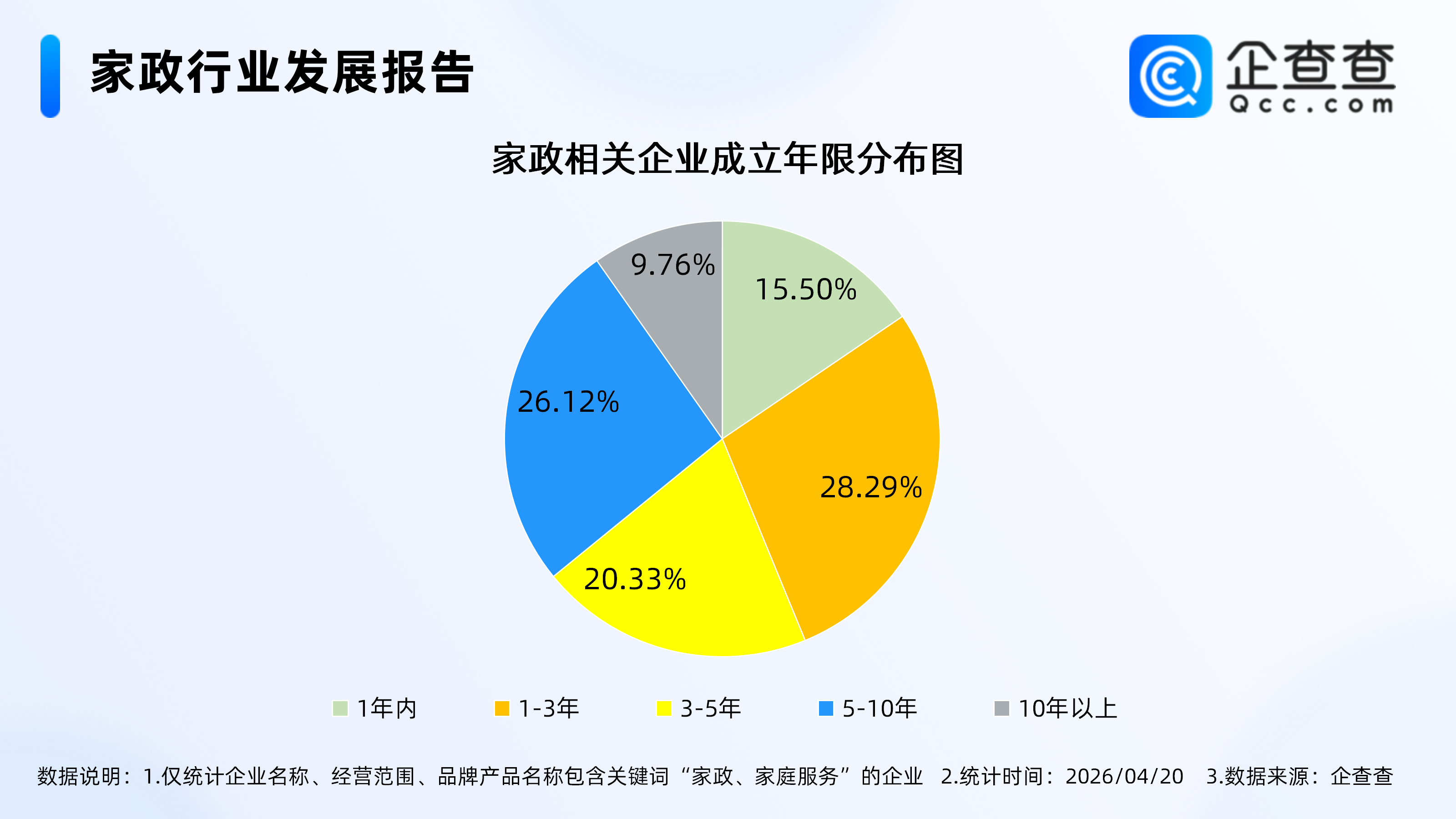 企查查数据显示,截至4月20日,国内现存家政相关企业302.78万家。现存家政相关企业多成立于近三年,合计占比超四成,其中成立年限在1-3年的企业最多,占比28.29%,成立于1年内的企业占比15.50%。