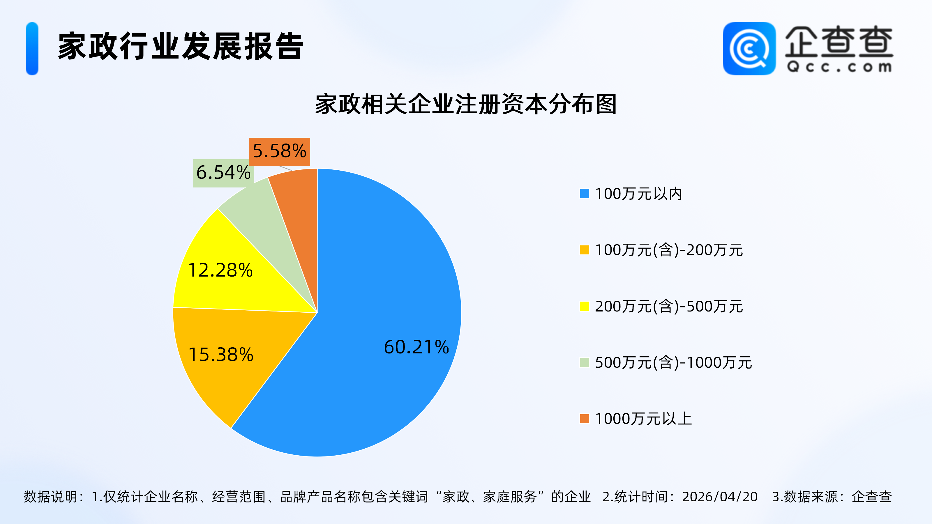 企查查数据显示,从注册资本来看,家政相关企业多为轻量级企业,注册资本在200万元以内的企业合计占比超七成,其中注册资本在100万元以内的企业最多,占比60.21%,注册资本在100万元(含)-200万元的企业占比15.38%。注册资本在千万级以上的企业占比5.58%。