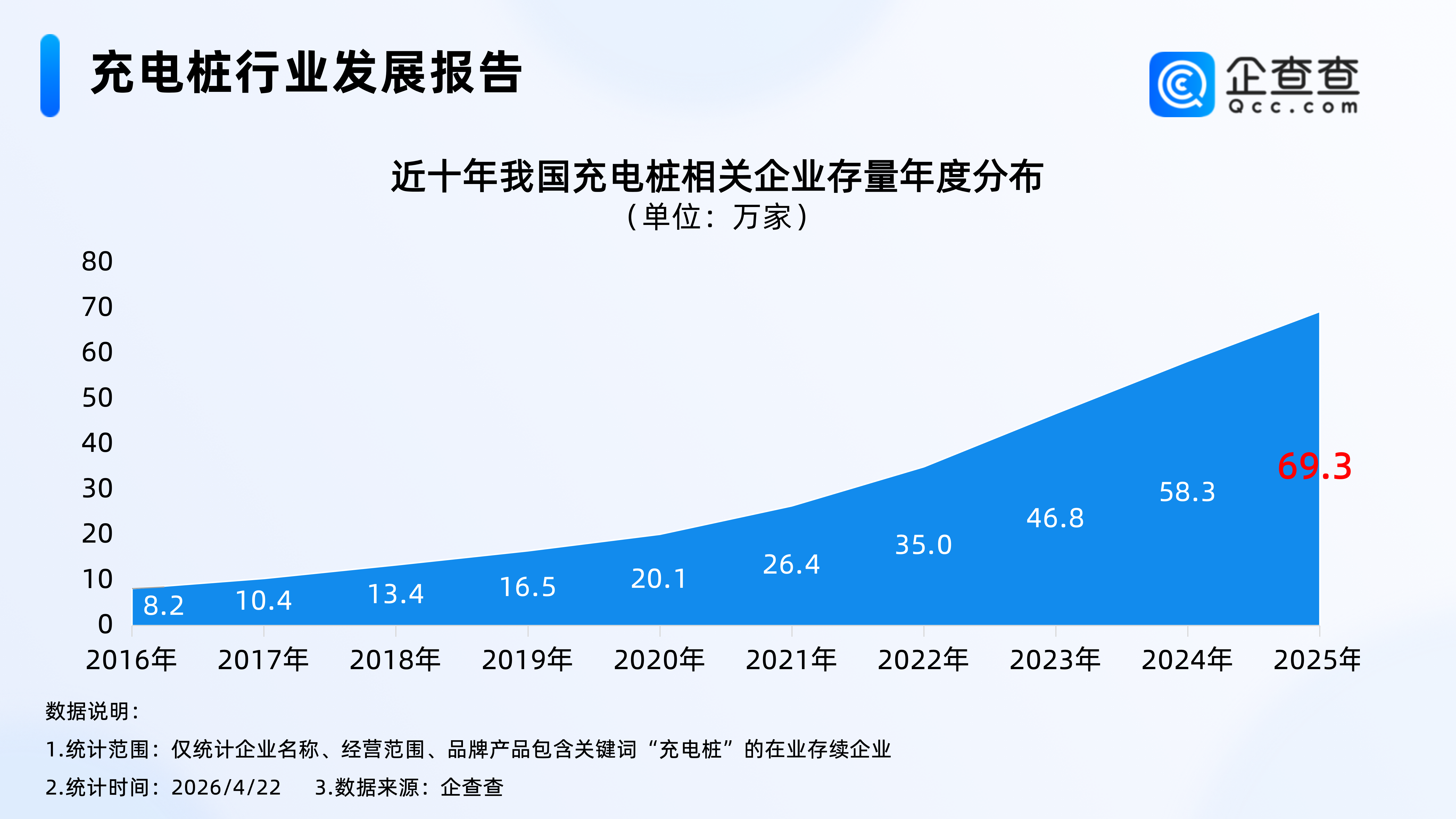 企查查数据显示,近十年,我国充电桩相关企业存量逐年增加,2025年年底,我国在业存续69.3万家充电桩相关企业。截至2026年4月22日,我国现存72.4万家充电桩相关企业。
