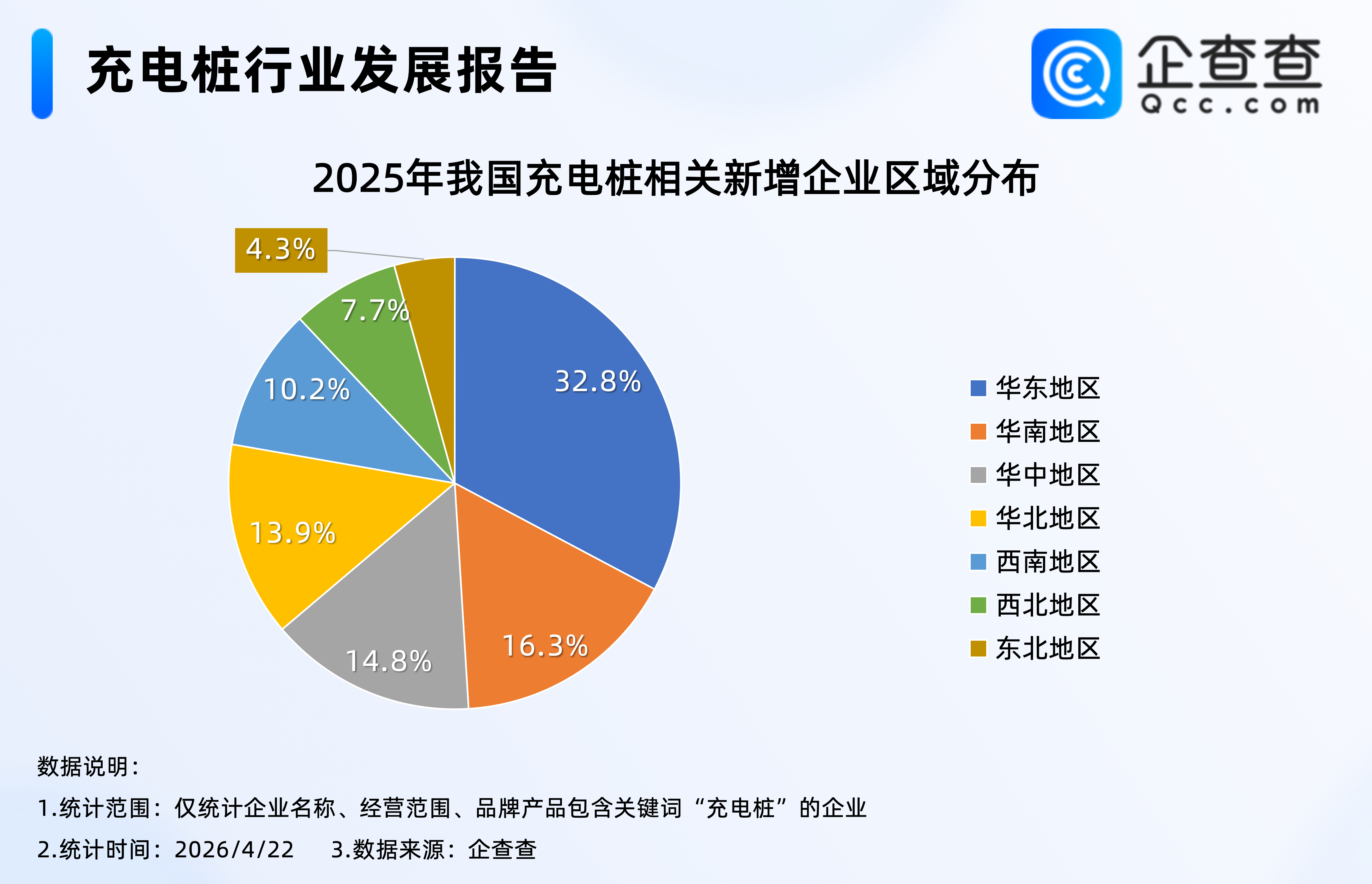 企查查数据显示,2025年注册的15.53万家充电桩相关企业中,位于华东地区的相关企业最多,占比32.8%,其次是华南地区,占比16.3%,西北、东北地区相对较少,分别占比7.7%、4.3%。