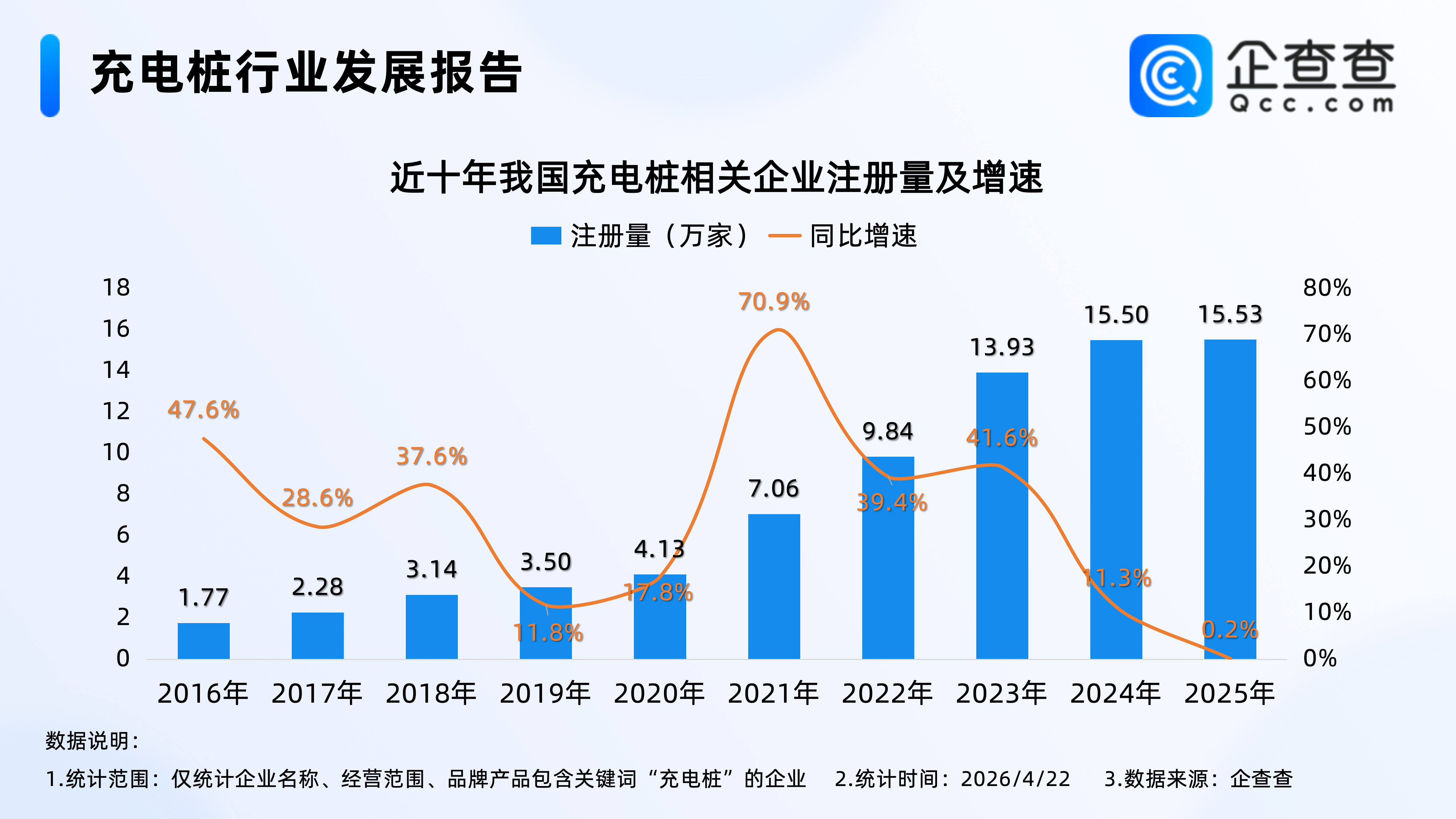 企查查数据显示,近十年,我国充电桩相关企业注册量逐年增加,其中2021年注册量同比大幅增加70.9%至7.06万家,达近十年注册量增速峰值,2025年全年,我国累计注册15.53万家充电桩相关企业,相比2024年同期基本持平,创近十年相关企业注册量新高。截至4月22日,2026年我国已注册4.3万家充电桩相关企业。