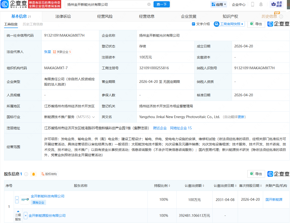 企查查APP显示,近日,扬州金开新能光伏有限公司成立,法定代表人为张星,经营范围包含:发电业务、输电业务、供(配)电业务;太阳能发电技术服务;光伏设备及元器件销售等。企查查股权穿透显示,该公司由金开新能(600821)间接全资持股。