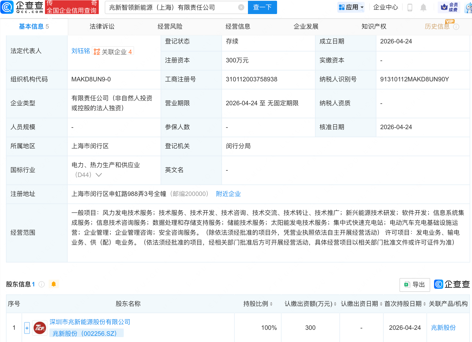 企查查APP显示,近日,兆新智领新能源(上海)有限责任公司成立,经营范围包含:储能技术服务;太阳能发电技术服务;集中式快速充电站;电动汽车充电基础设施运营等。企查查股权穿透显示,该公司由兆新股份(002256)全资持股。
