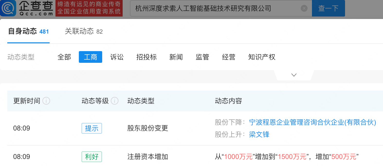 DeepSeek创始人增持深度求索公司,后者增资50%