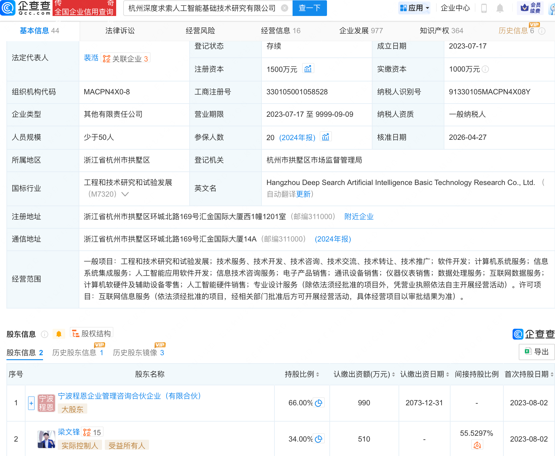 企查查APP显示,近日,DeepSeek关联公司杭州深度求索人工智能基础技术研究有限公司发生工商变更,宁波程恩企业管理咨询合伙企业(有限合伙)持股比例由99%降至66%,创始人梁文锋持股比例由1%升至34%,同时公司注册资本由1000万元增至1500万元,增幅50%。企查查信息显示,该公司成立于2023年,经营范围包含:计算机系统服务;信息系统集成服务;人工智能应用软件开发等,实际控制人为梁文锋。