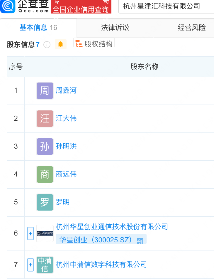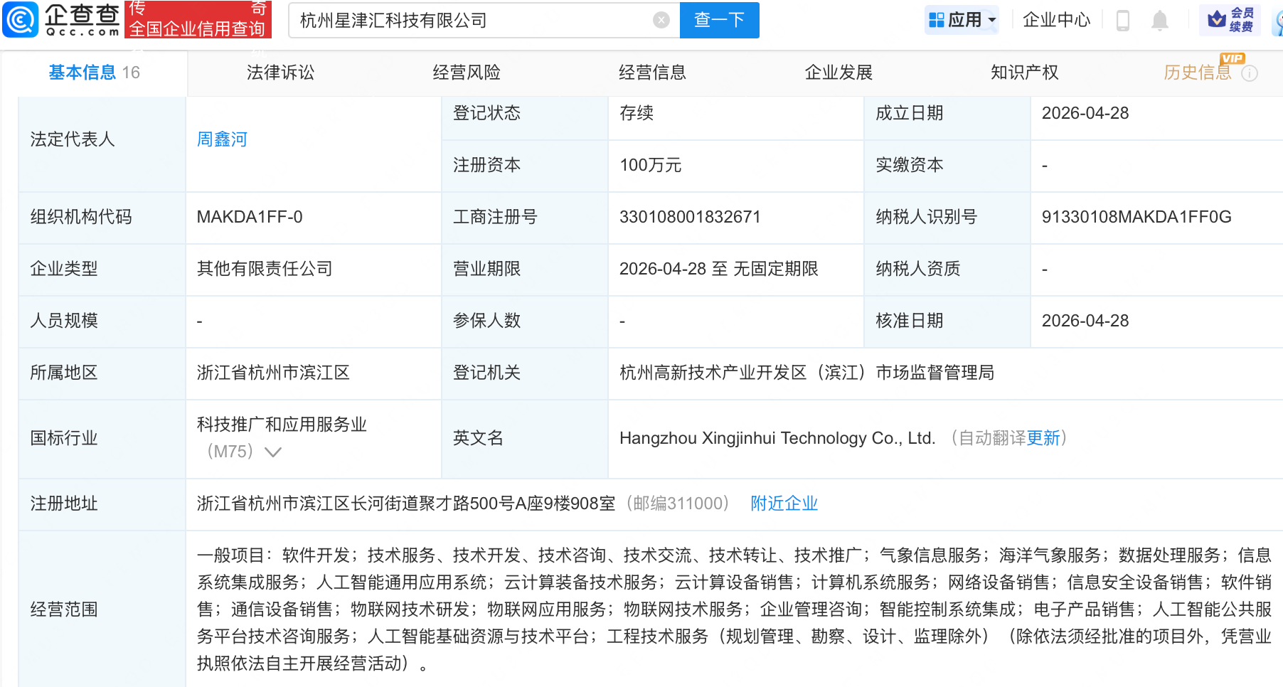 企查查APP显示,近日,杭州星津汇科技有限公司成立,经营范围包含:气象信息服务;海洋气象服务;人工智能通用应用系统;云计算装备技术服务;人工智能基础资源与技术平台等。企查查股权穿透显示,该公司由华星创业(300025)等共同持股。