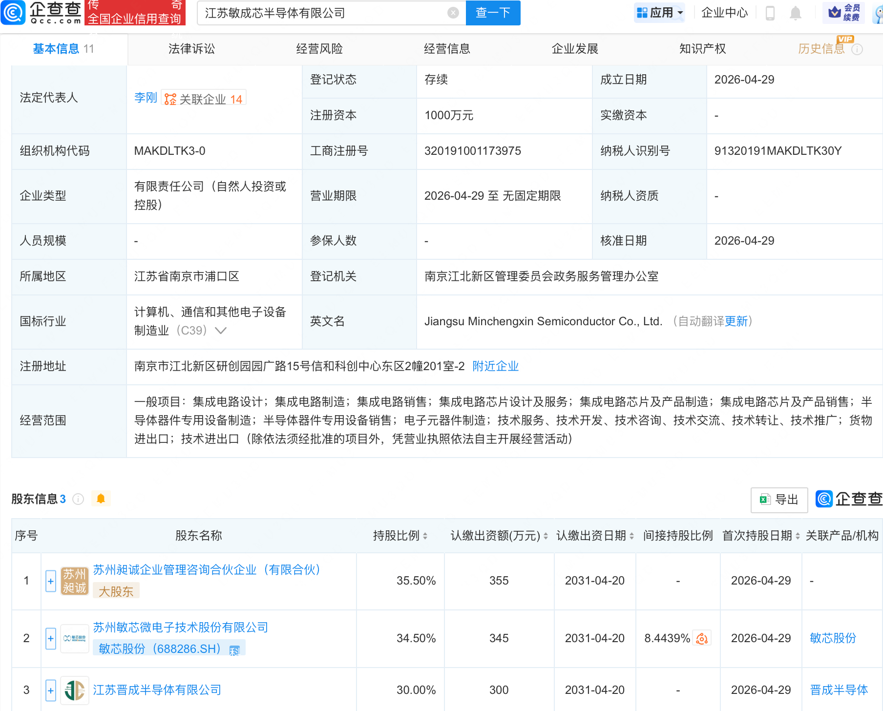 企查查APP显示,近日,江苏敏成芯半导体有限公司成立,注册资本1000万元,经营范围包含:集成电路芯片及产品制造;集成电路芯片及产品销售;半导体器件专用设备制造;半导体器件专用设备销售;电子元器件制造等。企查查股权穿透显示,该公司由敏芯股份(688286)等共同持股。