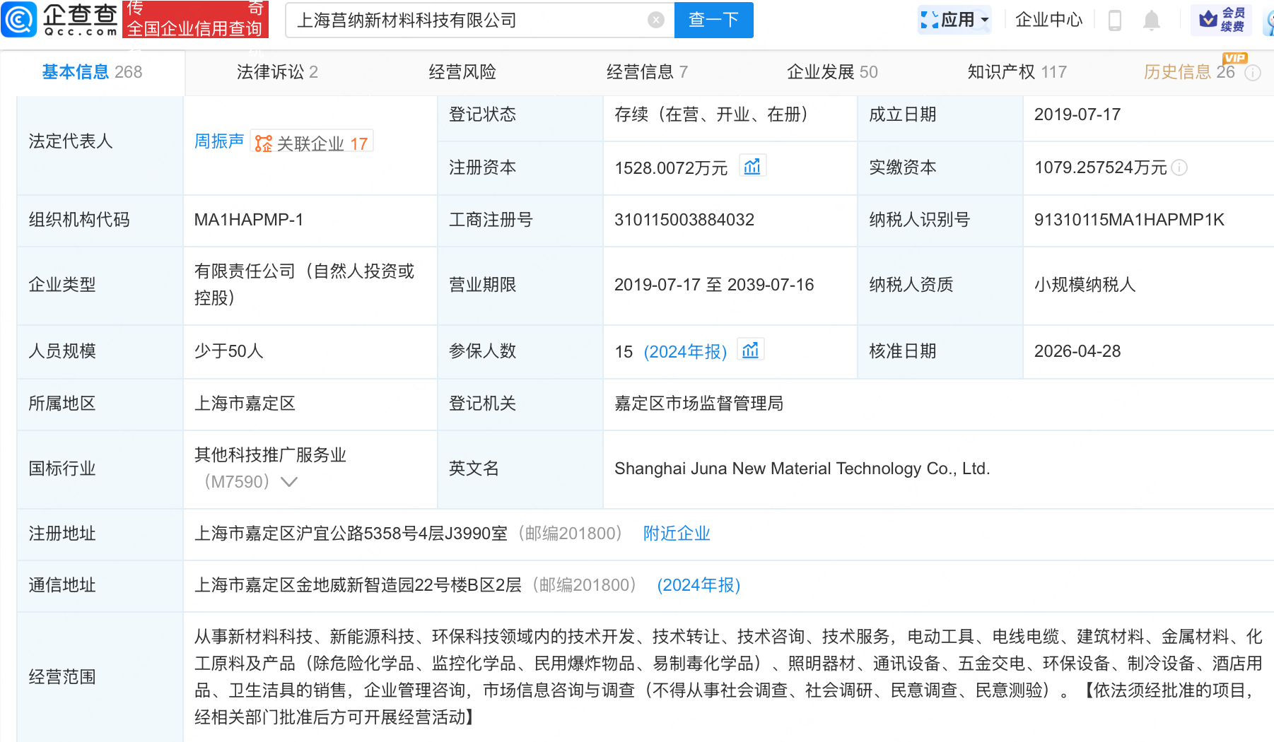 企查查APP显示,近日,上海莒纳新材料科技有限公司发生工商变更,新增宁德时代(300750)全资子公司宁波梅山保税港区问鼎投资有限公司为股东,同时注册资本增至1528万元。企查查信息显示,该公司成立于2019年,经营范围包含:从事新材料科技、新能源科技、环保科技领域内的技术开发、技术转让等。据其官网,该公司聚焦金属电化学材料科技的创新与产业应用,致力于成为绿氢电极技术的领跑者。
