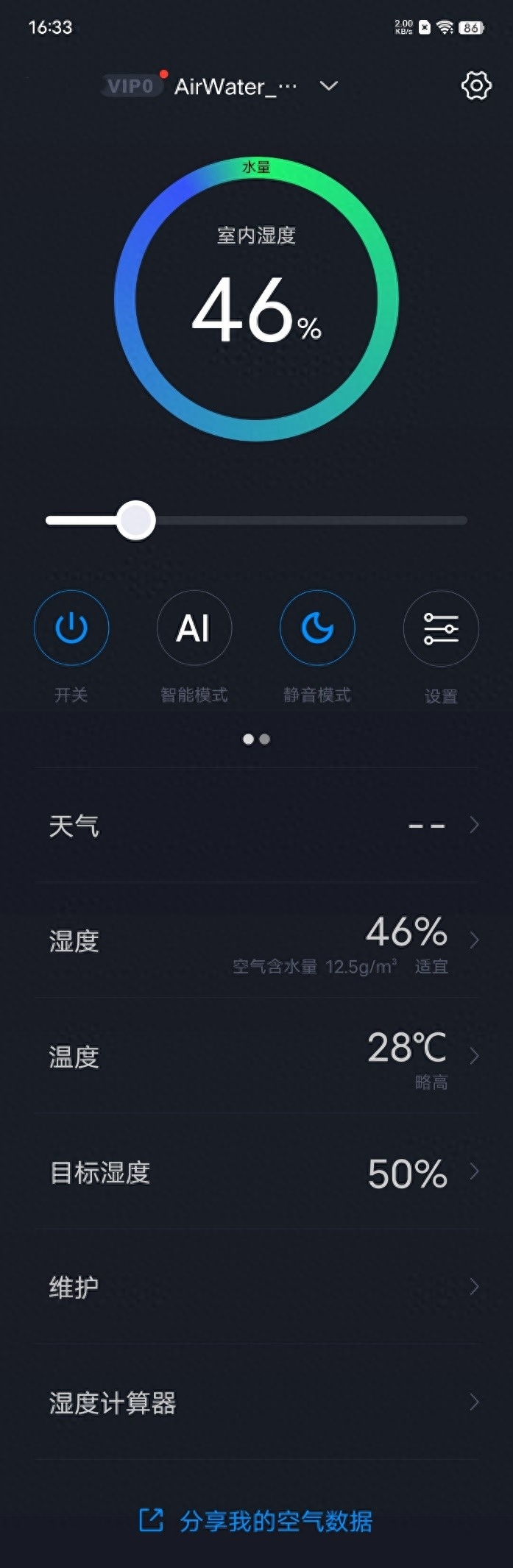 用户可以通过App对产品进行运行速度的调节,进行产品状态的查看,在产品水量不足、滤网状态不佳的情况下,App还会进行消息推送,提醒用户需要加水等信息。App还可提供当地的天气以及室内外空气湿度等信息。