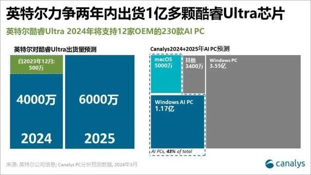 比如,英特尔公布了其雄心勃勃的计划,那就是在未来两年内要出货1亿多颗酷睿Ultra芯片,2024年将支持12家OEM厂商的230款AI PC。