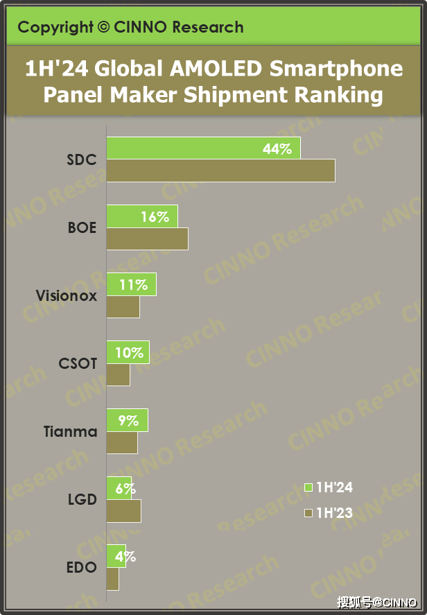 而在中小尺寸OLED领域,TCL华星和LGD当然也存在竞争关系,但竞争烈度并不是太大。丁科技网注意到,从CINNO Research 发布的2024年上半年全球智能手机用OLED面板出货份额来看,TCL华星排名第四,其身前还有排名第三的维信诺和排名第二的京东方。