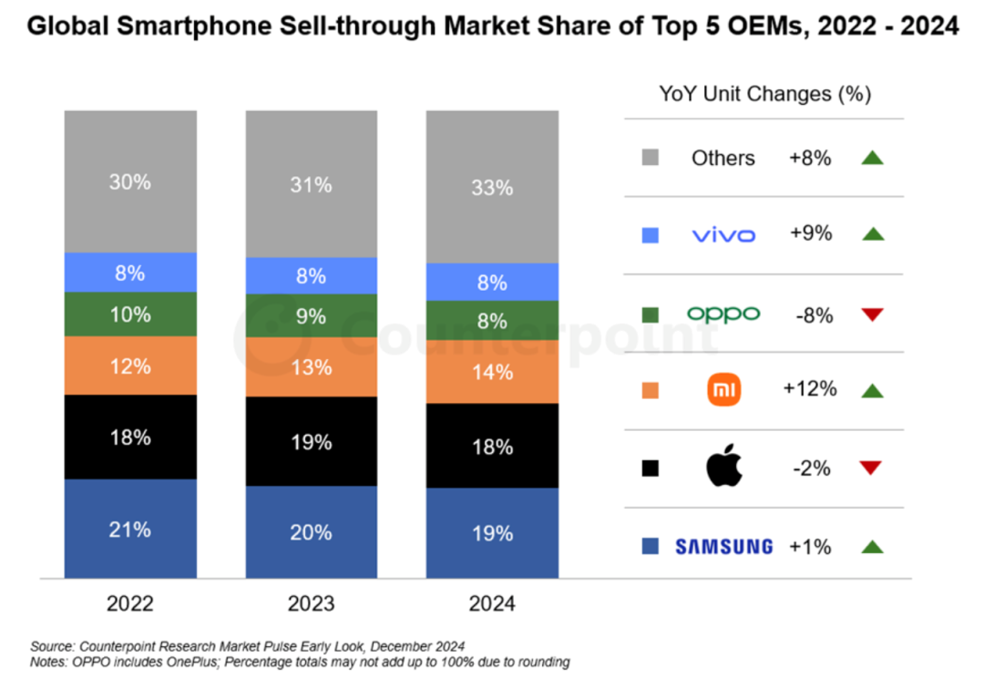 三星保持第一,占市场的19%;苹果第二,占18%;随后是小米,第三,占14%;OPPO第四、vivo第五,份额接近,均为8%。增长性上,三星增1%;小米增12%,是头部品牌中增长最快的;vivo增9%;前五外的其他品牌,增长8%。Counterpoint Research数据中特别指出,vivo2024“年末在中国市场排名第一。