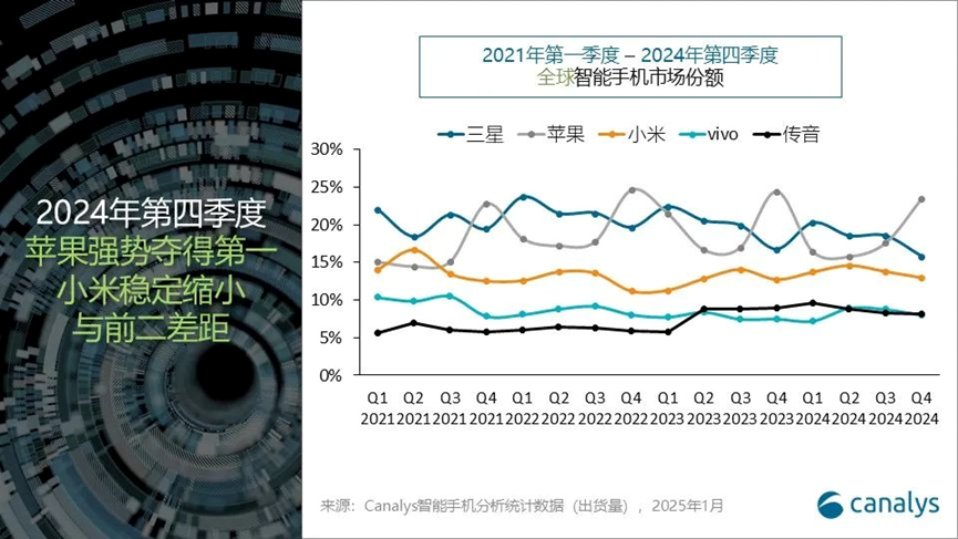 Canalys 数据显示,2024年第四季度,全球智能手机市场增长3%,达到3.3亿台,市场实现了连续五个季度的正增长。苹果在传统新机发布季排在第一,不过份额有所下滑;三星第二;小米第三,占13%,是前三中唯一实现同比增长的厂商;传音和vivo分列四五。