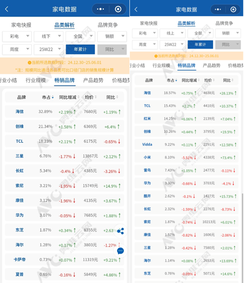 奥维云网数据显示,截至2025年第22周(6月1日),彩电业线下市场销售额达到57.58亿元,同比增长9.41%,均价达到6742元,同比增长2.28%;线上市场来看,彩电业销售额达到175.26亿元,同比增长17.63%,均价达到3106元,同比增长12.95%。