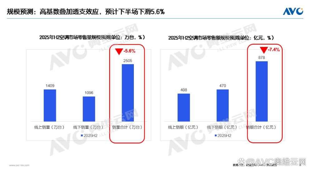 在价格内卷、库存高企、供需失衡以及气温回落等因素影响下,下半年空调市场的走势并不乐观。奥维云网预测,下半年空调市场销量将下滑约5.6%、销售额下滑7.4%。