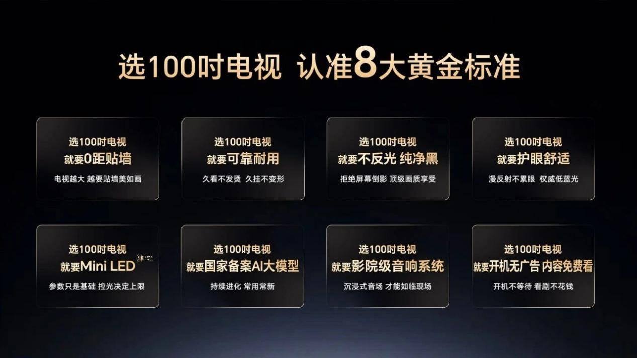 八大标准体系全面覆盖用户体验:一是“0距贴墙,美如画卷”,要求电视能够完全贴合墙面,融入家居环境;二是“可靠耐用,品质保障”,对散热性能和结构强度提出具体要求;三是“不反光纯净黑”,解决屏幕反光问题;四是“护眼舒适”,关注用户视觉健康;五是“Mini LED画质”,确保顶级显示效果;六是“国家备案AI大模型”,实现真正的智能体验;七是“影院级音响系统”,匹配巨幕观影需求;八是“开机无广告,内容免费看”,净化使用体验。