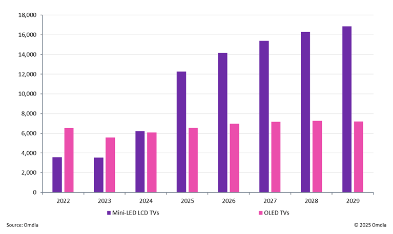 而此前市场研究机构Omdia预测,2025年Mini LED电视(含RGB-MiniLED)全球出货量有望达到1200万台,而OLED电视预计仅600万台。