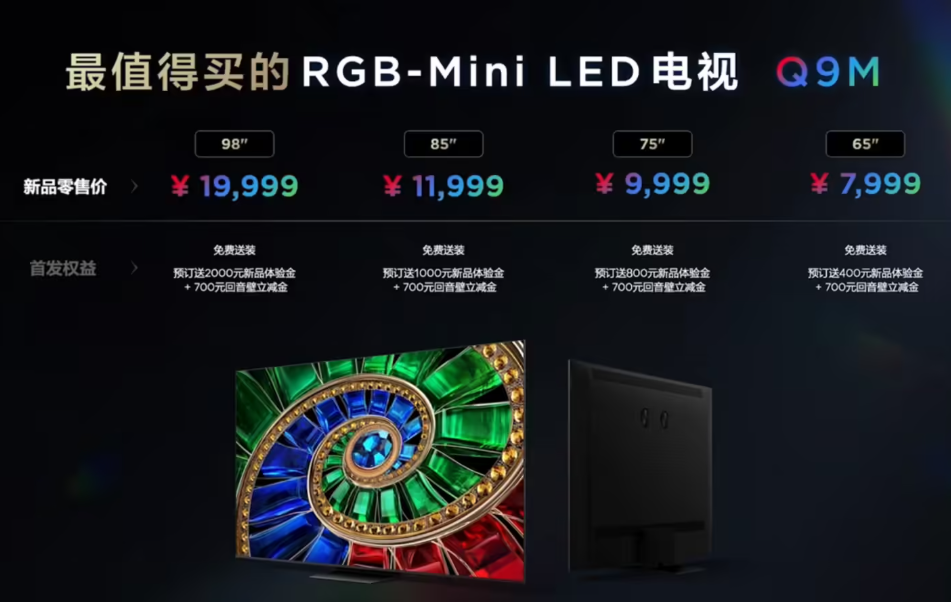 数据显示,75英寸以上OLED电视的平均售价约为1.2万美元,而同尺寸RGB-MiniLED产品已降至8000美元区间。钉科技注意到,TCL最新发布的TCL Q9M 系列,其65英寸、75英寸的价格仅为7999、9999元,将RGB-MiniLED电视的价格下探到万元以下。