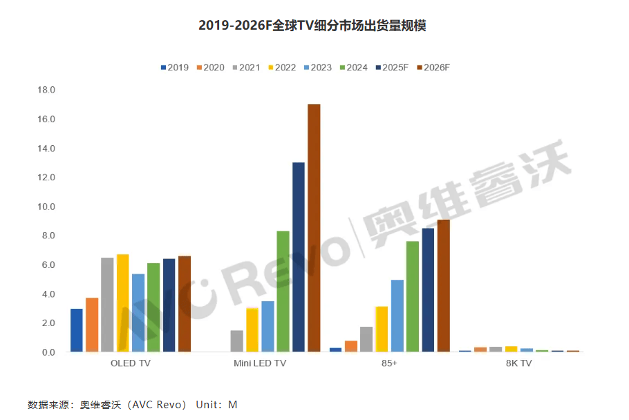 2025年,在海信、TCL、三星等巨头的共同推动下,全球RGB-Mini LED电视销量预计约为2万台,成功跨越了商业化的门槛。钉科技注意到,更惊人的增长将在2026年到来,奥维睿沃预测其全球出货量有望飙升至50万台,实现高达25倍的同比增长。
