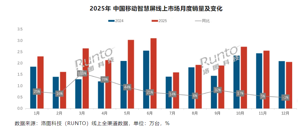 洛图科技数据显示,2025年中国移动智慧屏销量同比增长了33.5%,整体规模达33.8万台;销额为12.2亿元,同比增长27.7%;预计2026年中国移动智慧屏全渠道市场的销量将达到41.2万台,同比增速为21.9%。