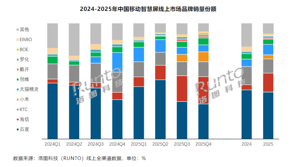 不过,市场增长的光环之下,品牌格局正在经历一场静悄悄的重塑。钉科技注意到,这类带点科技感的产品,一度是互联网公司的天下。比如,百度这个互联网巨头就长期占据这一市场的龙头地位。2025年,百度以40.6%的销量份额依然位居年度市场第一,天猫精灵也位列TOP5。
