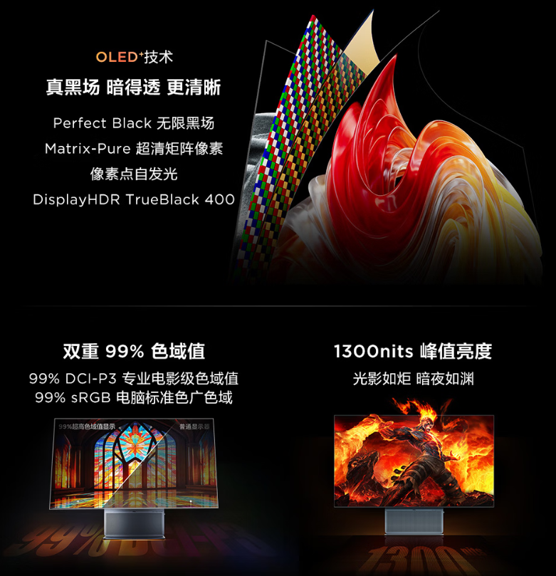 OLED+作为TCL自主研发的跨代技术,在传统OLED基础上实现全面升级。传统OLED虽有极致黑场,却存在文字彩边、强光发紫等问题,而OLED+技术通过像素矩阵重构和低反技术,完美解决这些痛点,阅读文字从此清晰舒适。2%超低反射率让强光下画面依旧通透。双重99%色域和原生10bit色深,以及屏幕压缩至6.4mm的超薄机身设计和 B&O 音响的搭配,让X3A成为全能代表,兼顾创作、影音与游戏需求。