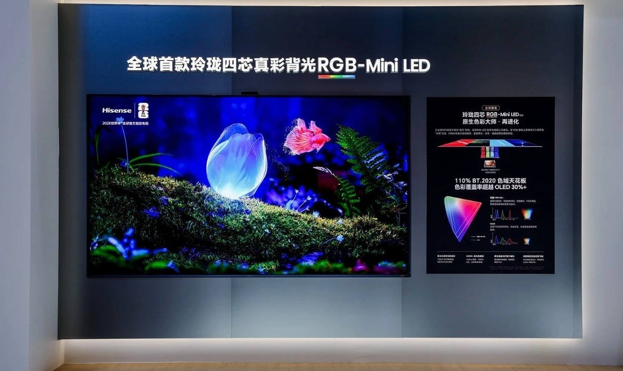 AWE2026上,RGB-Mini LED显示技术无疑是彩电馆的核心看点之一,尤其是搭载全球首创玲珑4芯真彩背光的海信RGB-Mini LED电视UX2026款,更成为焦点明星。作为液晶显示进阶方向的高端显示技术,RGB-Mini LED在领军企业海信的带动下,2025年以来也正从“概念秀”加速走向“规模上量”。