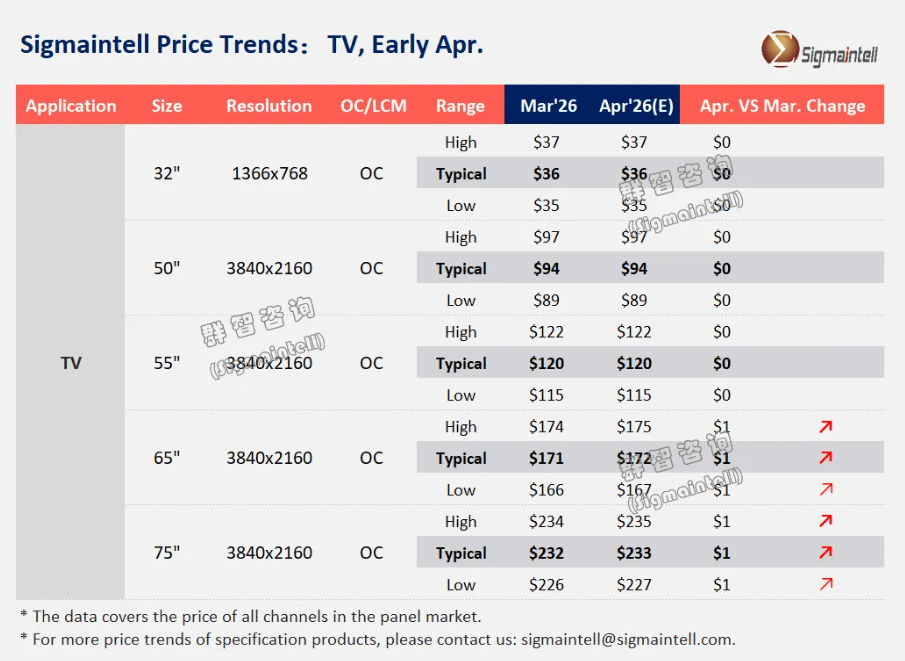 根据群智咨询2026年4月上旬发布的TV面板价格风向标,全球电视面板市场正在进入一个微妙的分化期。