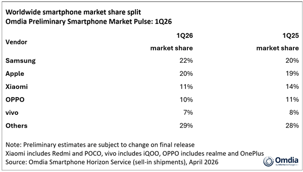 在看谁是行业老大的问题上,数据“打架”的痕迹明显。钉科技注意到,依据Omdia数据,三星凭借Galaxy S26系列的强劲预售表现,以22%的市占率重夺全球第一的宝座,苹果则紧随其后占据了20%的份额。