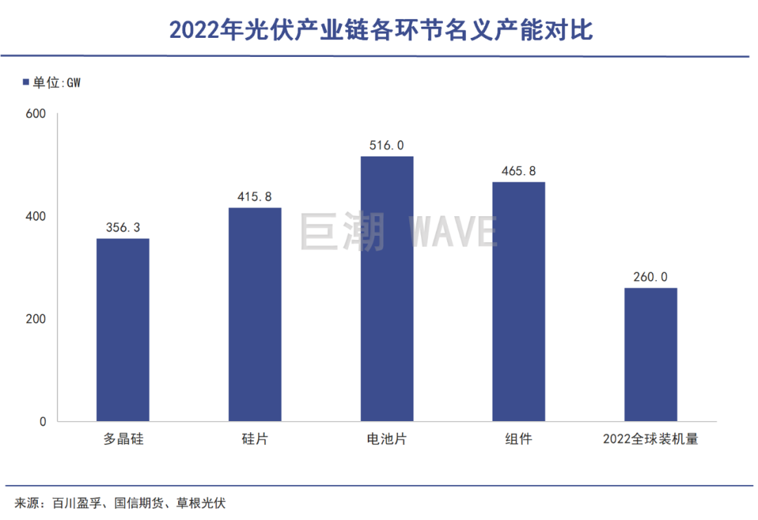 而2022年的全球光伏装机量约为260GW,在不考虑开工率的情况下,可以看到当前国内光伏产业链各环节产能都已经远远超出了全球光伏装机量,产能过剩已经成为趋势。