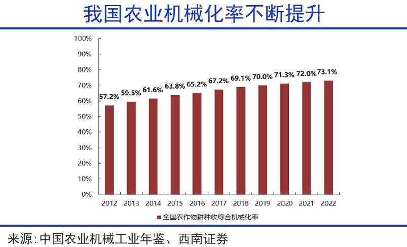 发达国家农耕机械化率平均能达到90%,我国机械化率在2022年已经超过73%,还有上升空间。