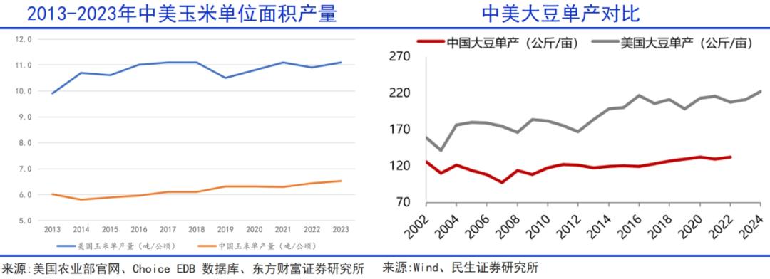 也就是说,我国和美国在大豆生产效率上,有将近一倍的差距。在玉米方面,单产也是中国的1.6倍。总的来看,美国农民人均可以养活166人,而我国为4人。