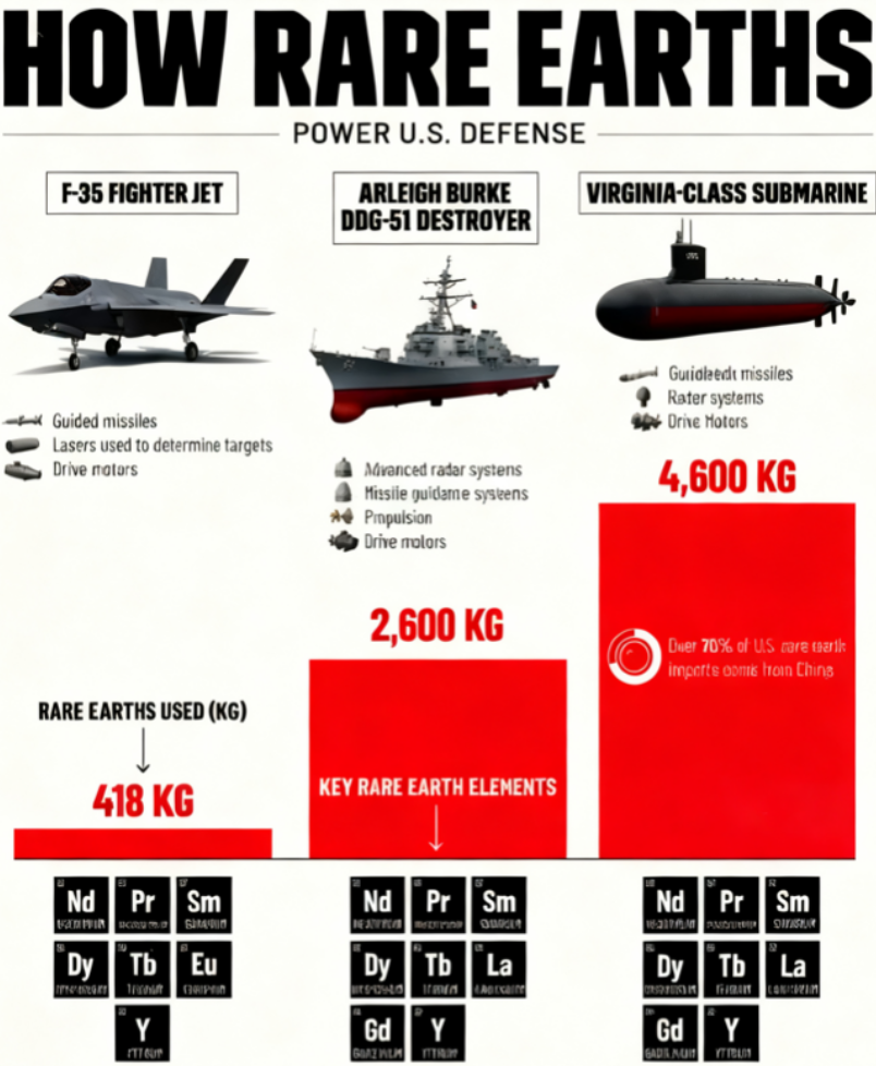 美国基准矿产情报公司指出,F-35战斗机需要418KG的稀土,阿利•伯克级DDG-51驱逐舰需要2600KG,一艘弗吉尼亚级潜艇则需要使用约4600KG。倘若稀土断供,这些美国高端军事装备根本造不出来。