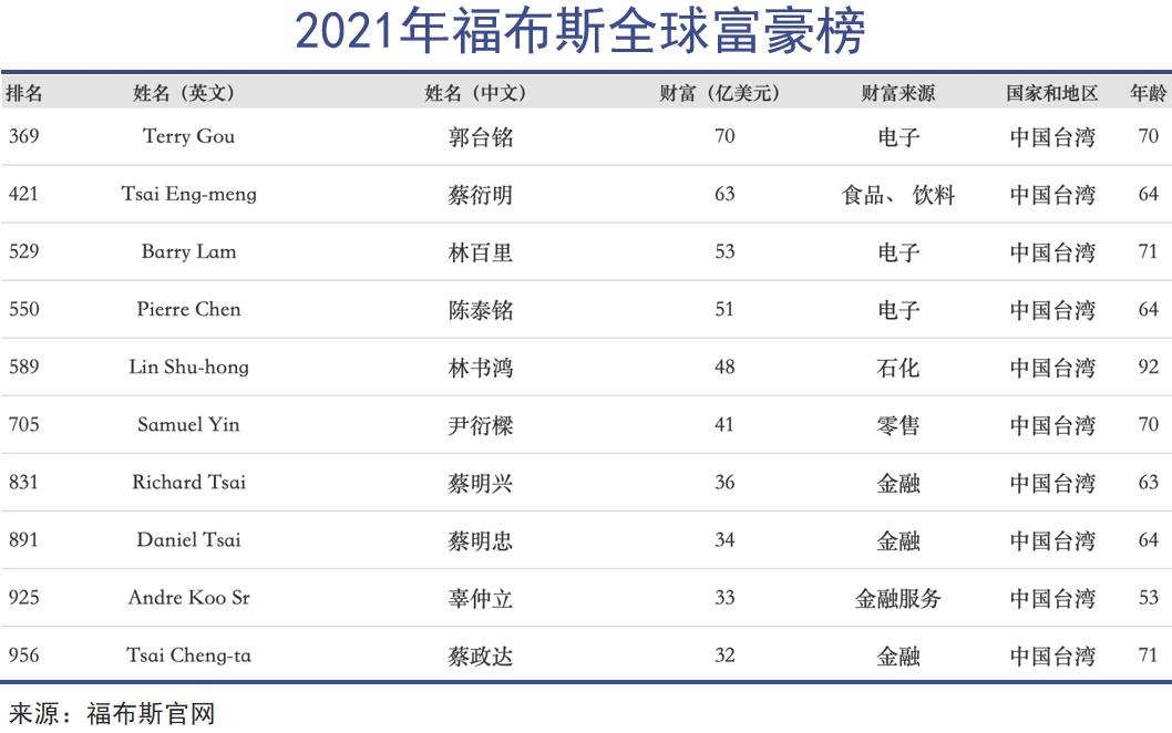 翻阅福布斯官网,郭台铭上一次登顶台湾首富是在2021年。当时福布斯在排名时将富豪单列,同一企业的多个实控人单独排列,时年70岁的郭台铭以70亿美元身价位居台湾省最富有的人。