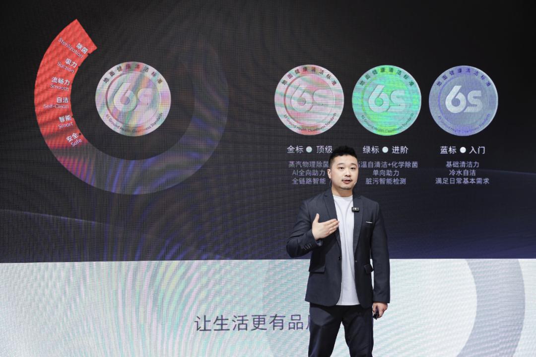 结合大量调研调查,《白皮书》提出6S地面健康清洁标准,从除菌、吸力、智能化、自清洁、安全等多个维度,全面规范家庭地面清洁要求。在这一基础标准之上,《白皮书》还进一步围绕不同家庭场景与健康需求,构建了金、绿、蓝三级健康标识体系。其中,蓝标聚焦基础健康,满足单身或年轻家庭的日常清洁;绿标主打进阶健康,以高温自清洁等功能适配多口或老人家庭;