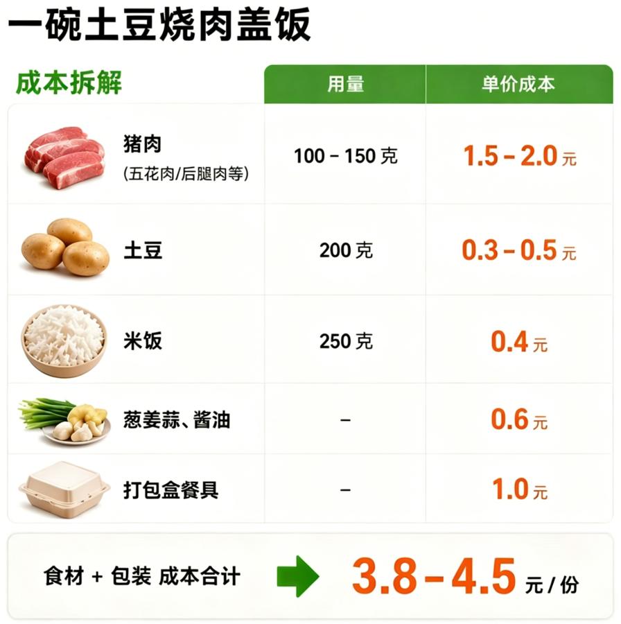 一份土豆烧肉盖饭,通常包含猪肉约100-150克、土豆约200克、米饭约250克,加上葱姜蒜、酱油、打包盒。按当前批发价来算,一份土豆烧肉盖饭的食材加包装成本大约在3.8-4.5元。