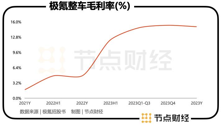 2021年-2023年,极氪总营收分别为65.27亿元、318.99亿元和516.73亿元,期间复合增速高达181.4%;创立首年毛利率即为正,之后一路攀爬,至2023年达到15%,在高端纯电领域仅次于特斯拉。