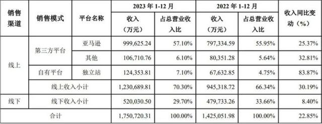 目前,安克创新对亚马逊的依赖仍然不小。2023年报显示,去年安克创新在亚马逊平台上的收入高达99.96亿元,占总营收的比例高达57.1%,同比增长1.15%。