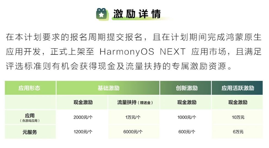 于近日,华为最新公布鸿蒙原生应用开发者激励计划,开发者报名参与该计划后,满足激励条件最高可获得10万元现金奖励和相应的流量扶持。