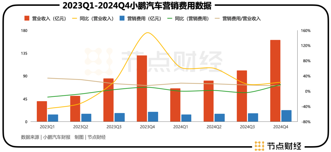 小鹏的亏损,不见得都是坏事。从费用拆分来看,光是研发费用就已经超过了毛利润的总额。一直以来小鹏在研发方面的投入都是较高水平,2024年研发投入占总营收的16%,相比来看理想汽车只有7.66%。
