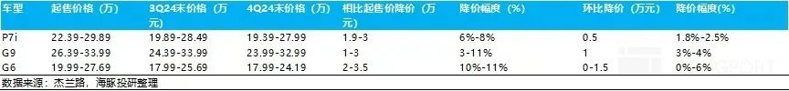 改版的G6和G9起售价分别是17.68万元和24.88万元,相较于老款19.99万元和26.59万元的起售价有所下调。并且在2024年第四季度,为了清库存和迎接改款周期,小鹏老款的三个主力车型P7i、G6和G9都已经下调了价格,幅度在3-10%不等。