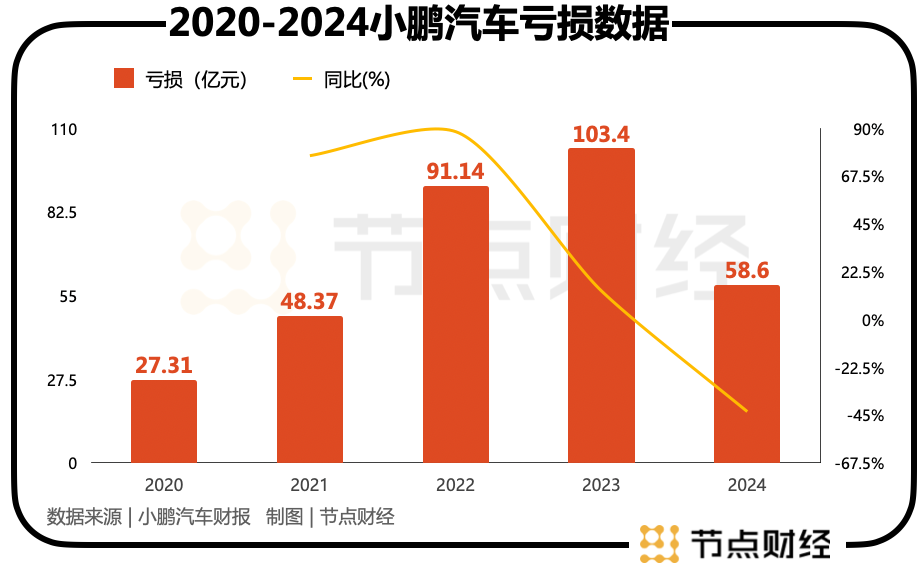 2024年小鹏净亏损57.9亿元,折算到每台车上,就是卖一辆车亏3万元。而从2020年上市以来小鹏过去五年累计亏损已经达到了328.82亿元。