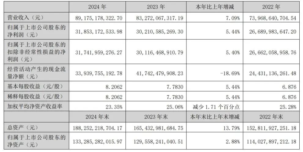 4月25日晚,五粮液发布了2024年度报告和2025年第一季度报告,数据显示,2024年,五粮液实现营业收入891.75亿元,同比增长7.09%;归母净利润318.53亿元,同比增长5.44%。2025年一季度,公司实现营业收入369.40亿元,同比增长6.05%;归母净利润148.60亿元,同比增长5.80%。