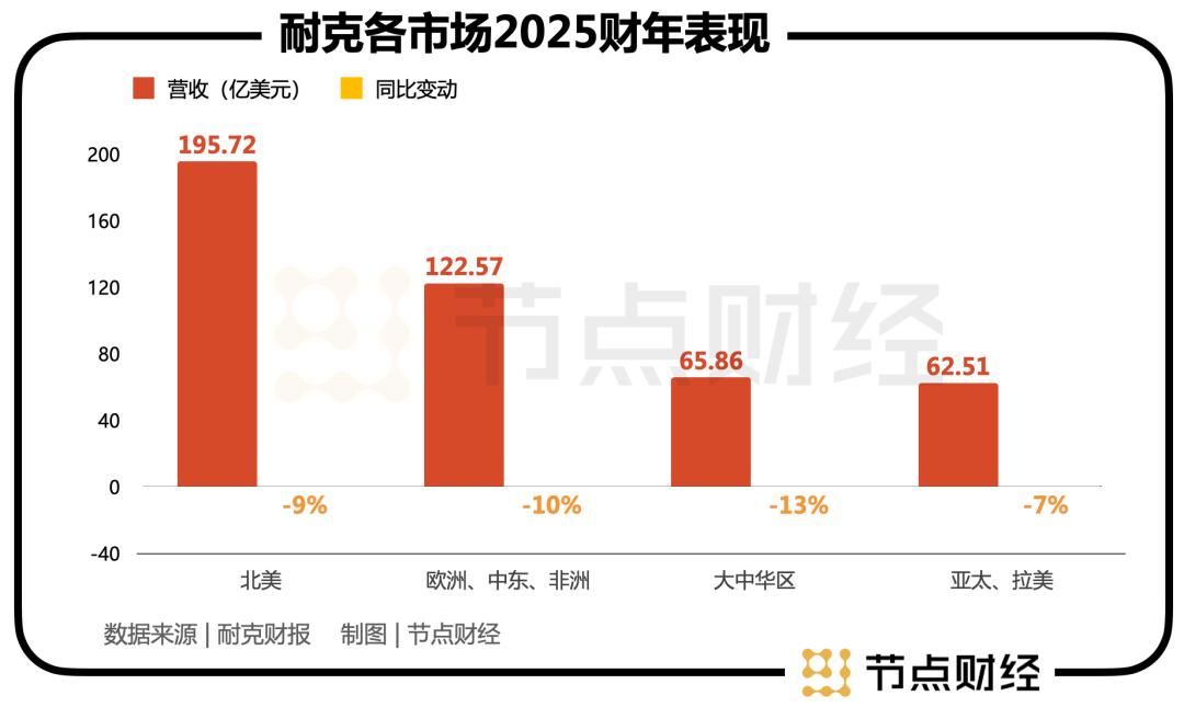 耐克6月27日公布的2025财年(2024年6月-2025年5月)财报显示,耐克营收为463亿美元,同比下降10%。其中耐克大中华区全年收入仅为65.86亿美元,同比跌去了13%,相当于比上一财年少赚9.59亿美元(约70亿元人民币)。这一数据远超其他地区跌幅,大中华区成为了耐克全球表现最差的市场。另外,耐克整体的净利润,同比下降44%至32亿美元。